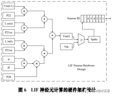LIF神经元计算模块采用流水线设计来提高吞吐率,如图7所示,由神经元输入缓冲经过一系列 乘加运算得到当前的神经元膜电位,如果膜电位大于阈值则会输出结果到神经元输出缓冲,输出的脉冲携带神经元的id(Identity),将发出脉冲的神经元id存储到共享内存,并按照输出顺序排列在一段连续的内存空间,设置结束标志位为0,直到读取到0,则说明本轮神经元更新所发射的脉冲读取完毕。单个神经元计算模块存在4个乘法并行单元,以及2个加法并行单元,充分利用了神经元计算模块内的并行性。