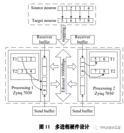 如图 11 所示,多进程采用分布式内存的方式,每个进程包含发送缓冲和接受缓冲,在脉冲神经网路仿真开始前将网络拓扑结构映射到 NEST 仿真器,为每个线程和进程分配神经元,发出的脉冲信号通过以太网从发送缓冲发送到接受缓冲。每个进程节点配备单独的 DDR3 内存,可增加整个系统的内存容量,并提供更高的计算性能,但同时也需要考虑多节点的 通信问题。
