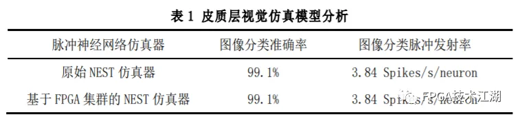 本文NEST仿真器中神经元计算模块采用单精度浮点数据精度,与原NEST仿真器的神经元计算模 块双精度浮点数据精度相比,在皮质层视觉模型仿真图像分类的准确率和脉冲发射率方面并无差别,其结果如表1所示。