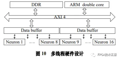 多线程采用共享内存的方式,使用 2 个 LIF 神经元硬件模块同时读写 DDR3 内存,可充分发挥 DDR 的带宽优势,但由于线程之间的存在上下文的切换,多线程的加速比并不能达到理论的最大值。