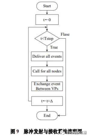 其中 t 为仿真步长,Deliver all events 为将所有的脉冲事件从本线程的接收 buffer 中取出,并根据全局 id 发射到相应的神经元,Call for all nodes 是更新计算所有的节 点,Exchange event between VPs 是通过 MPI 技术将发送 buffer 的数据进行交换。