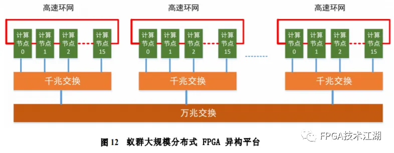 (4)专用平台:本课题提供规模更大的专用实验平台为大规模分布式 FPGA 异构平台。如图 12 所示是蚁群平台的总体架构,平台的每个模组(组装在一个机箱内)有 16 个 FPGA 异构计算节点。模组内部的计算节点除了采用千兆以太网连接之外还有板级的高速环网, 为支持灵活的 SNN 通信机制空间探索提供了硬件支撑。目前已达到一百个计算节点规模的类脑计算集群平台。