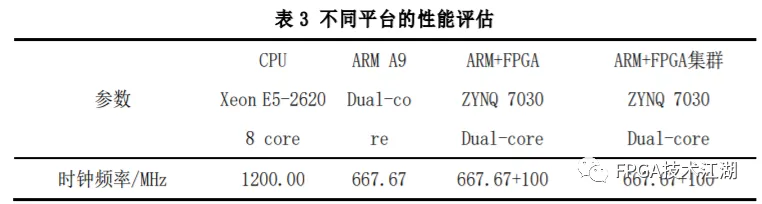 本文实现基于FPGA集群的脉冲神经网络仿真器NEST,以皮质层视觉模型仿真为案例,分别对比 Inter服务器版八核CPU Xenon E5-2620和ARM A9双核CPU,其时钟频率、内存、性能等,如表3所示: