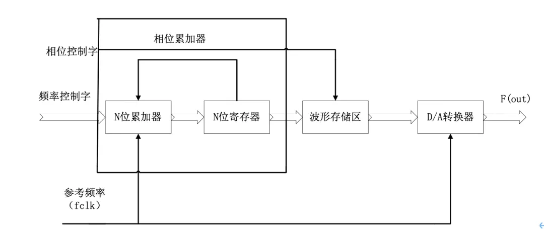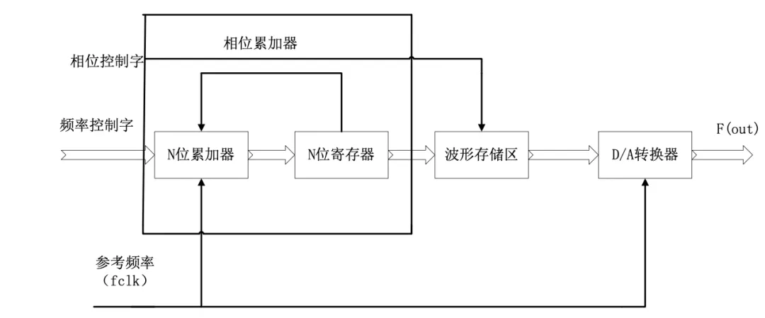 下面根据下图所示的DDS技术原理框图,当一个参考时钟过来 传输一个频率控制字进入累加器在累加器中加入上一个参考时钟的数据,相加后进去寄存器,然后寄存器的输出便是正弦查表的地址,通过这个数据在波形存储区查表,再通过D/A转换器和低通滤波器输出。结合项目功能要求实际分模块实现任意波形发生器。