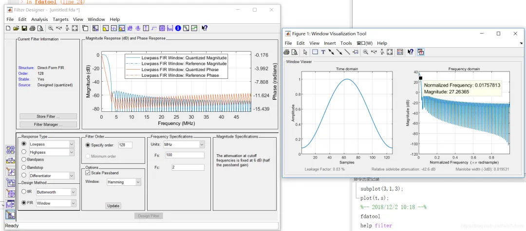 (3)调用FIR IP核,对其参数进行设置。利用Matlab对滤波器的参数进行设置。在matlab窗口输入fdatool,在弹出的窗口中,在Response Type(滤波器响应类型)一栏中选择Lowpass(低通),Desgned Method(实现方法)选择Window(窗函数实现),即基于窗函数法设计FIR滤波器,我们在Options中选择Hamming窗,Filter Order中选择Special Order,滤波器阶数选择128(阶数越高,滤波效果越好,占用的芯片资源会更多些)Frequency Specializations中单位Units选择MHz,采样频率Fs选择100MHz(根据奈奎斯特低通信号采样定理,采样频率至少高于信号的2倍,实际工程上一般得高于低通信号频率的5-10倍,如果信号频率过高的话,实际的AD采样频率核精度无法达到,所以工程上一般把低通信号经调制后搬到频率很高的载波上,再下变频到中频上用带通采样定理进行AD采样),之前提到采样频率高于信号频率的5-10倍就可以,因为我们这里FIR滤波器时钟是和板卡时钟连接在一起的,没有编写时钟分频模块,所以这里采样频率直接设置为100MHz(一个周期点数为100MHz/2MHz=50,板卡资源会浪费一些,但是不影响),截止频率Fc设为2MHz(1MHz的正弦波通过,9MHz的被滤除),点击View和Design Filter按钮,设计的滤波器时域和频域波形(Time Domain and Frequency domain)以及幅相响应(Magnitude and Phase Response),最后生成coe文件,加载到FIR IP核中。具体设置如下图。