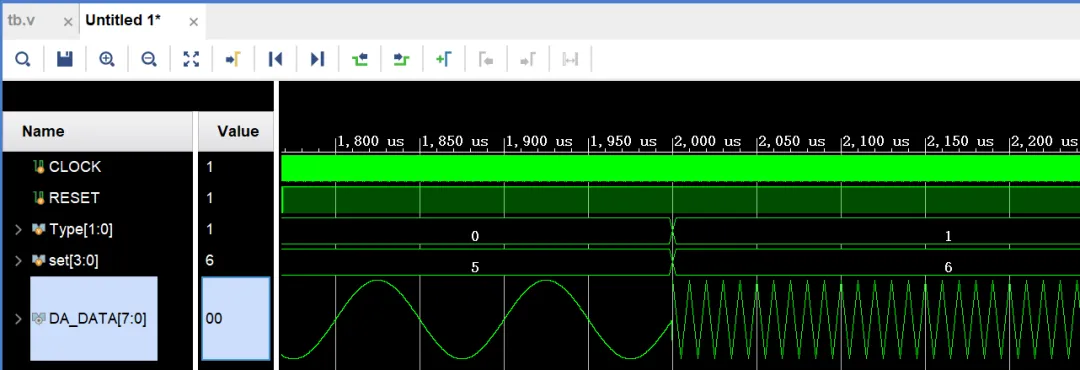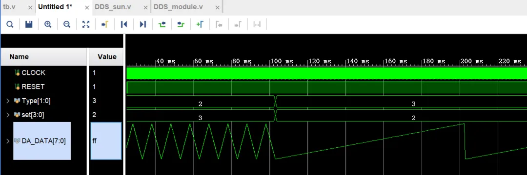 最后通过顶层模块,例化DDS模块与UART模块,将相应输入输出连接起来,编写仿真激励文件,给串口助手发送值,验证波形输出。