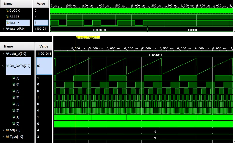 如上所示,根据仿真波形可知,当仿真输入1011010011011,FPGA收到11001011,类型控制字11(3),频率设置控制字0100 (4),输出周期为 1ms(即频率为1KHz)的 锯齿波;