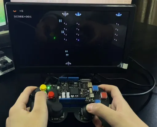 (3) 我们外接了自制游戏手柄,可以直插在开发板上,方便地控制游戏。