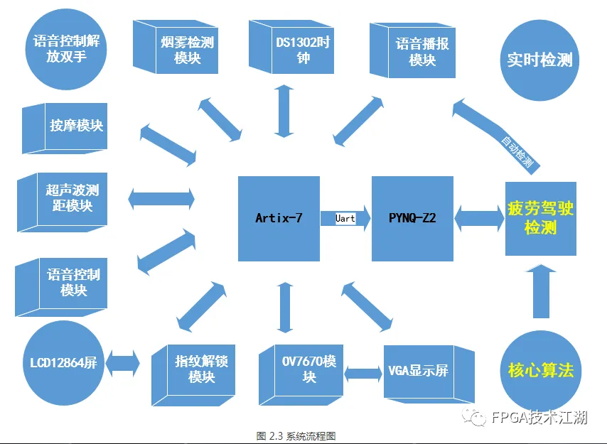 系统主要包含:疲劳驾驶检测、倒车辅助、语音控制平台、安全车距检 测等部分组成,总体流程图如 2.3 所示。系统可实现开机自启,并实时检测 驾驶者的疲惫情况,辅助功能模块由语音控制功能协调控制,实现解放双手 安心驾驶的目的,同时语音播报提醒驾驶员疲惫状况以及车辆周围障碍物情 况并及时反馈给驾驶者,达到预防交通事故发生的目的。