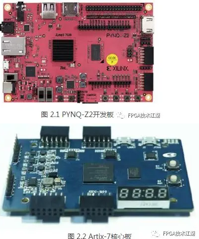 本作品的核心系统疲劳驾驶检测搭载于 XILINX Zynq-7000 系列 PYNQ-Z2 开发板,开发板如图 2.1 所示,其主芯片为 XC7Z020CLG400-1,该芯片为 FPGA+ARM 架构并且可用于 python 开发,同时提供了丰富的 python API 和完 善的硬件设计流程,为较复杂算法的编写及应用提供了新思路。同时使用 Artix-7 核心板为辅助功能模块显示控制中心,如图 2.2 所示。