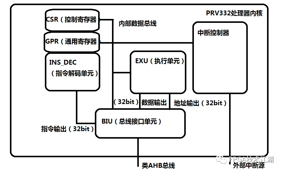 整个SoC的PRV332处理器核心如图5所示,PRV332SV0处理器内核是一款支持RISCV-32 I和A拓展指令集,完全实现RISCV定 义的所有功能的处理器,不仅具备机器模式(M)模式下运行,还支持虚拟内存MMU 和系统(S)用户(U)模式,理论上完全具备运行类linux系统的能力。这款处理器内核主要由BIU(总线接口单元),EXU(执行单元),INS-CSR-GPR(指 令-CSR-通用寄存器单元),中断控制器组成,简单原理框图如图6所示。