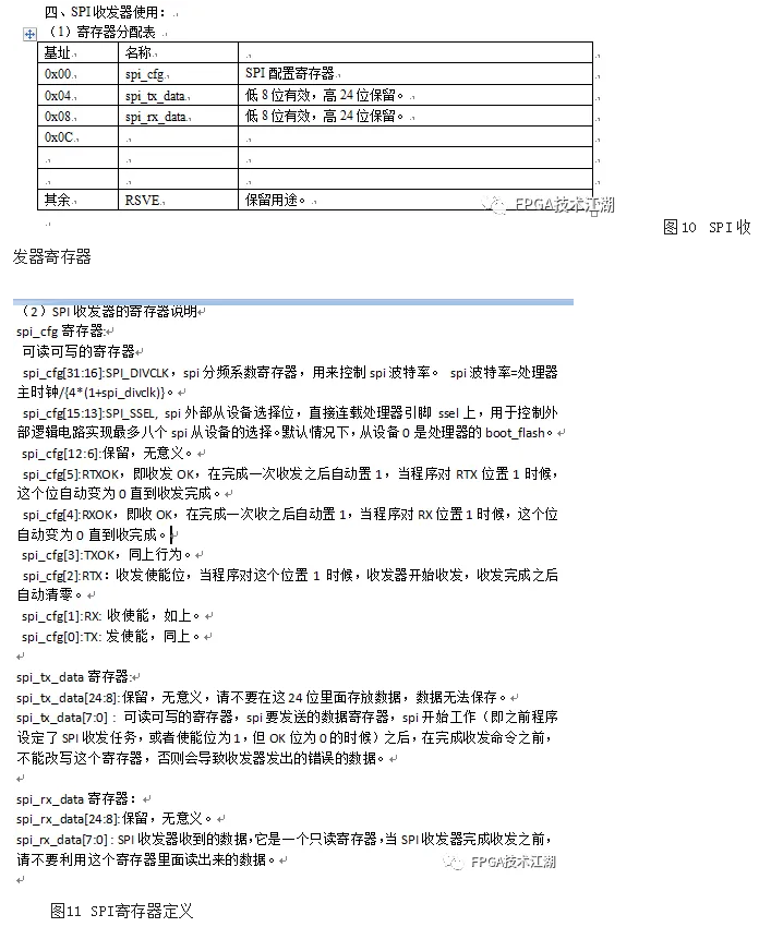 PVS332具备一个硬件SPI收发器,如图9所示,可以使用额外的门电路可以同时管理八个从设备。以下截图来自于《PVS332处理器编程手册》,描述的是SPI收发器的地址和操作,分别如图10、图11所示。