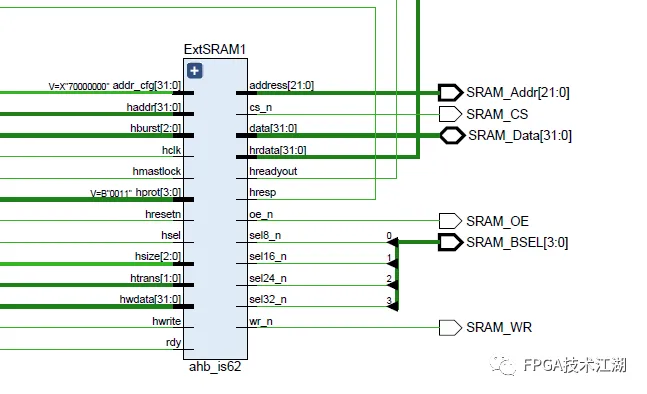 在拓展插槽上图20所示,我们使用32个IO作为双向数据总线,22个IO作为地址总线,4个IO作为字节选择线, 2个IO作为读写使能线,1个IO作为准备好信号输入线。总线工作频率为8MHz(FPGA工作频率33MHz时)。最大传输速度为32MB/s。为了实现多个外部设备,我们将A19-A21作为一个3-8译码器的输入信号,使用该3-8译码器获得8个译码器信号,这样外部就可以获得8个插槽的片选信号。其余的A0-A18作为地址线,配合四个字节选择线可以寻址8 * 512K * 4Byte的空间。