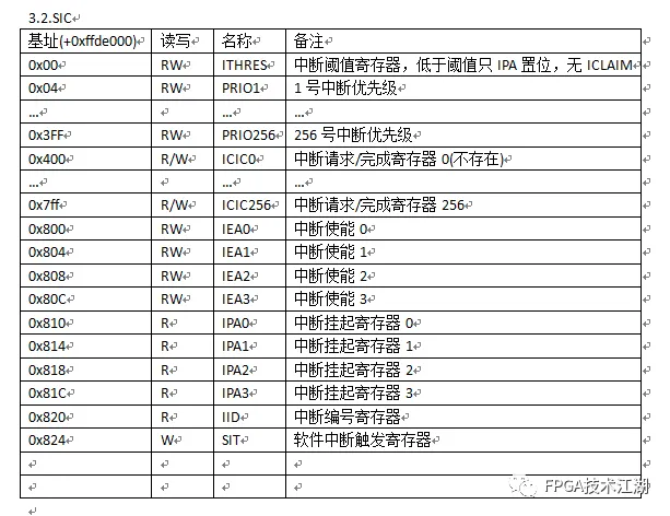 PVS332 SoC中有一个控制寄存器(图17 控制寄存器组)控制整个SoC的各项功能。控制寄存器组里面包含了:(1)系统定时器PVS332 SoC支持RISCV架构定义的系统的定时器(MTIME、MTIMECMP)这两个寄存器在0x0ffc0000-0x0ffc000f的空间里。该定时器在MTIME计时到MTIMECMP之后会产生定时器中断,只有当程序更新了MTIME或者MTIMECMP寄存器之后中断才会被清除。(2)软件中断控制器软件中断控制器可以让程序使用置1的方式产生同步的软件中断。(3)中断控制器(SIC)SIC可以支持最多256个外部中断的管理,并可以配置它们的优先级,由这个寄存器管理的中断源最后都连接在PRV332处理器的ext_int中断上,触发中断之后PRV332的xcause寄存器将会被更新为外部中断,软件可以查询SIC里面的中断挂起寄存器而找到是哪个外部设备发起了中断。图18是SIC的寄存器列表,详情可见附录中的《PVS332编程手册》