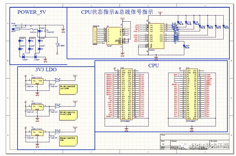 如图19,在这个部分里的CPU位置,可以插入上述FPGA核心板作为系统主板的CPU,该核心板一共有96个可用IO,我们将IO分配为:拓展卡IO、通用输入输出(GPIO)、SPI收发器 三个部分。在旁边的稳压器部分,主要为板上的逻辑芯片供电。同时我们搭载了多个指示灯用于指示系统的运行状态。