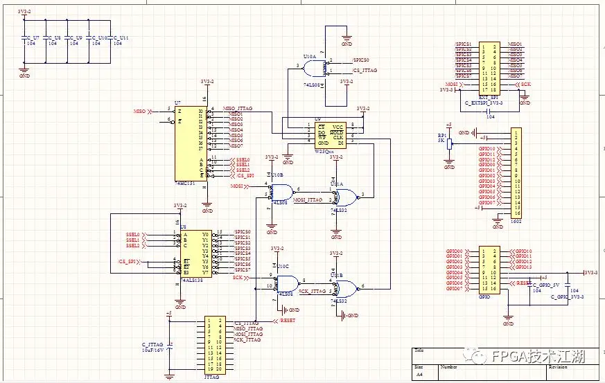 SPI部分同样使用3-8译码器作为从设备选择信号,而后使用一片8-1数据选择器作为八个SPI从设备的MISO选择。FLASH部分使用额外的74系列逻辑芯片搭建了复用器,在调试器对系统进行复位时(/RESET为低),此时复用器将FLASH的引脚切换给调试器的MOSI、MISO、SCK、CS使用。当调试器烧录FLASH完成之后,/RESET被拉高,此时该复用器将FLASH切换给主系统的SPI收发器使用。