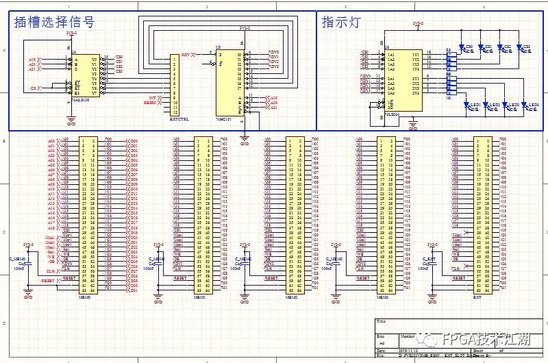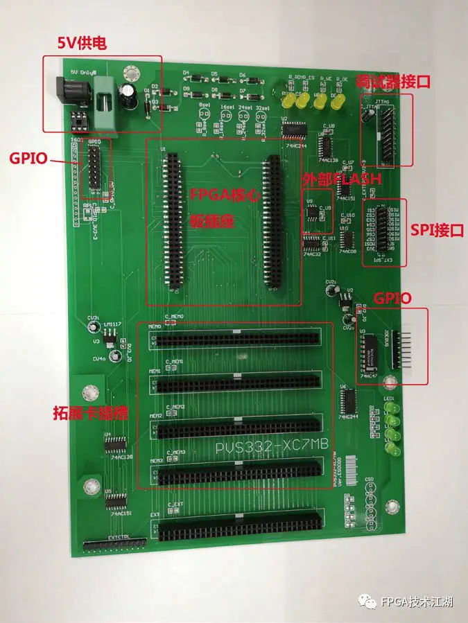 系统主板分为3大部分,分别为FPGA插座部分、拓展插槽部分、SPI和GPIO和flash部分。
