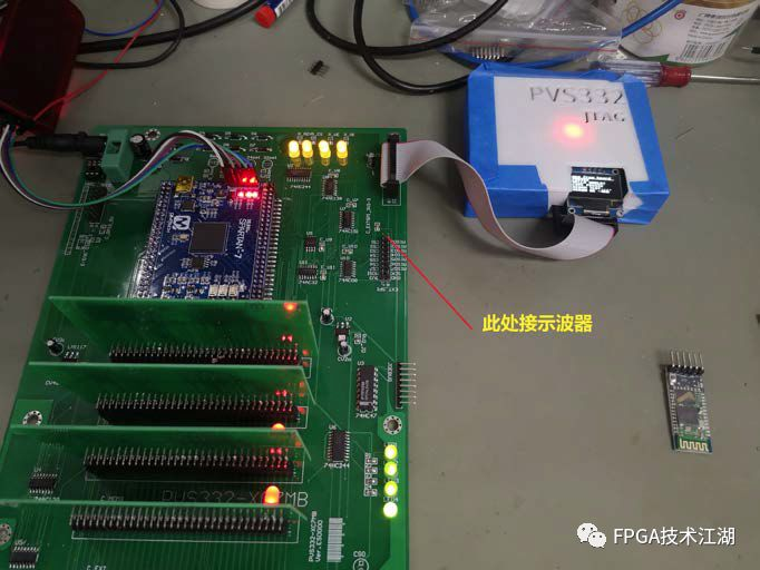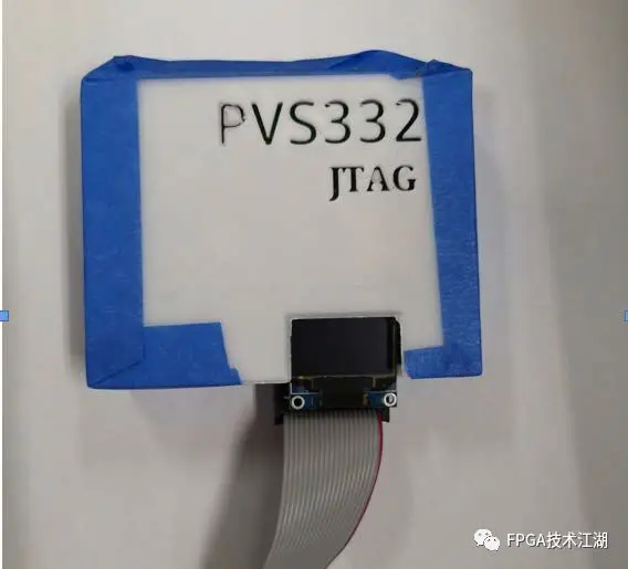 首先我们将上述仿真过的汇编代码使用PRV332IDE生成COE文件,如图34所示;接着我们将该COE文件作为PVS332系统里面BOOTROM的内容烧录到FPGA里面。为了更好的观察SPI收发器的工作情况,我们搭建如图35所示的测试电路。在该测试电路里,系统主板的调试接口和调试器通过排线连接在一起,由于系统主板的SPI收发器0和调试器有硬件连接,调试器监视SPI0收发器的数据,故我们用示波器观察系统主板上SPI0的SCK和MOSI线上的数据。