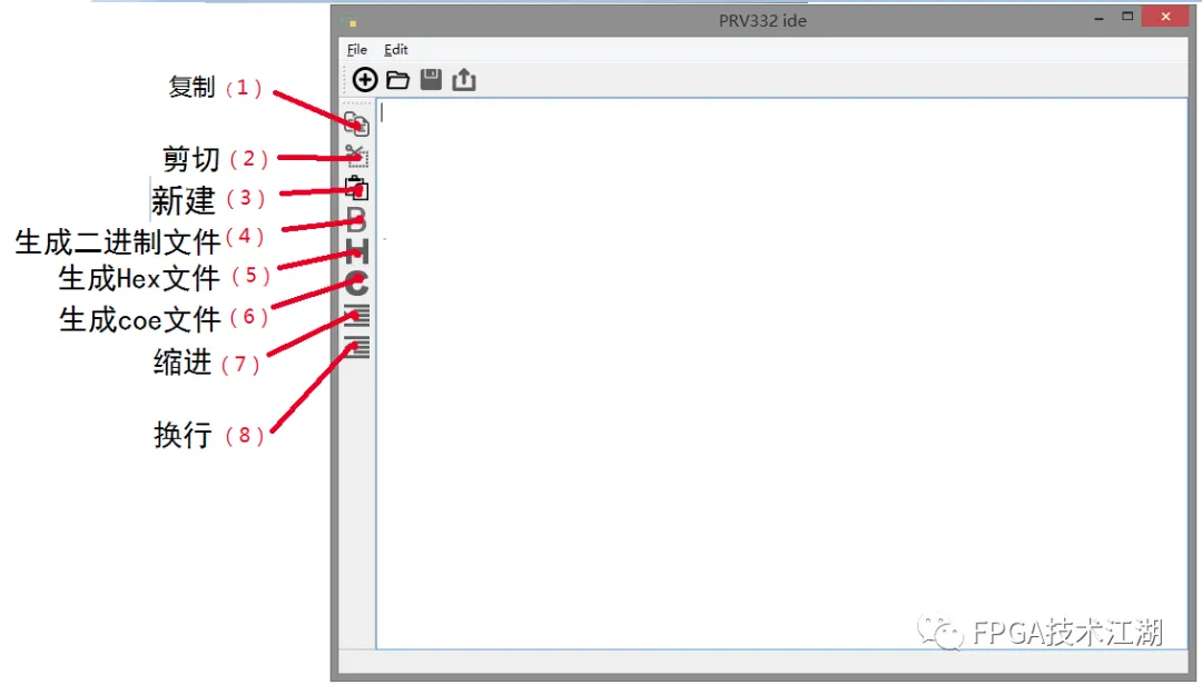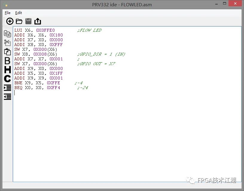 如图28所示,IDE功能从上到下依次为:复制文件、剪切文件、新建文件、生成二进制文件、生成Hex文件、生成coe文件、缩进、换行。其中生成二进制文件可以让汇编代码直接被仿真器仿真;生成的Hex文件可以直接烧录到flash里面,配合SoC内部的BOOTLOADER程序使用;生成的coe文件可以作为xilinx FPGA的ROM里面的内容。