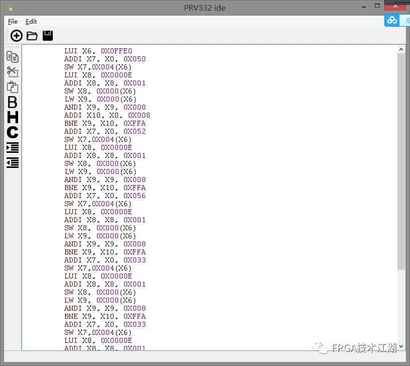 软件部分我们完全自主研发了一个IDE-PRV332IDE,具备编辑RISCV汇编,生成多种机器码文件的能力,可以极大的方便程序验证和调试工作。IDE界面如图27所示: