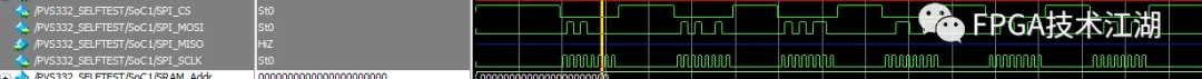 然后我们打开modelsim,直接开始仿真,可以看到SoC的SPI有关引脚上出现了我们希望看到的数据,如图33所示。
