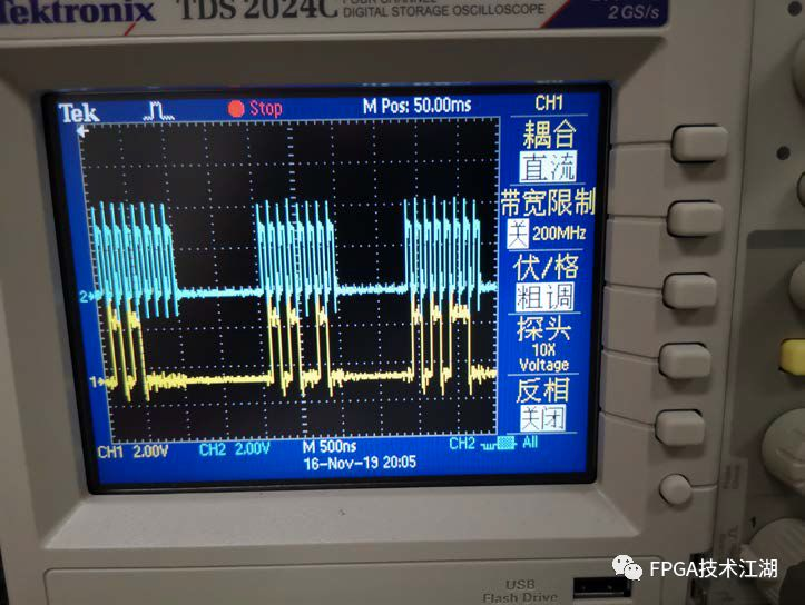 同时在示波器上也可以看到SPI收发器正常工作,图37所示: