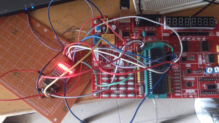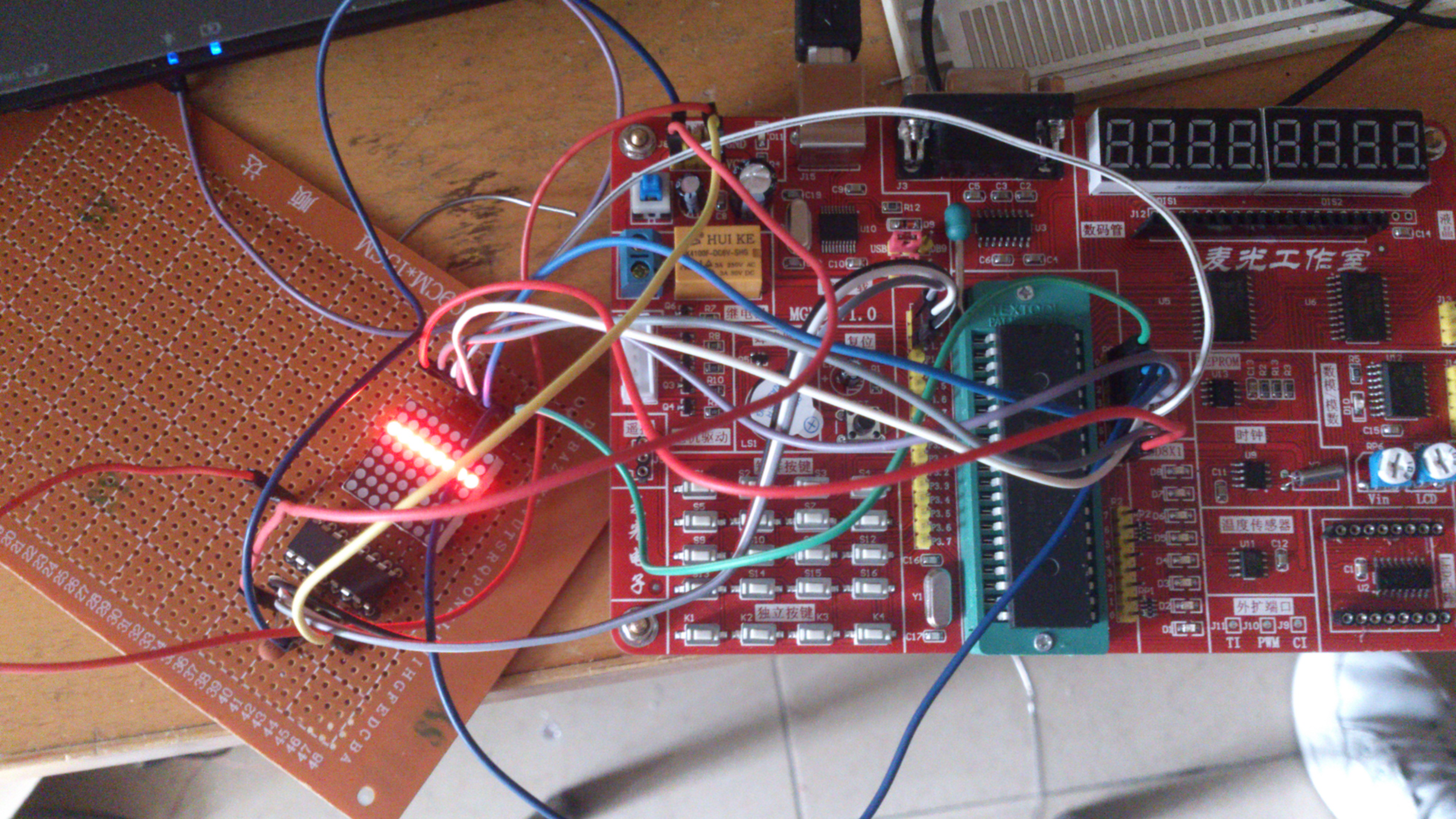 在上次也就是周二——前天发现自己把点阵和数码管直接焊在开发板上,导致数码管不能使用。当天中午便跑到实验室用吸锡器吸了好一会发现完全没辙。恰巧当晚学校的电子爱好者协会成立,认识了几位在实验室的学长。昨晚便请学长帮我取出点阵,因为那时我在看刘平老师的视频,点阵篇。学长和我有一墙之隔,待得学长忙会了一会后过来告诉我说点阵是被取出来了,但是点阵模块是不能用了。我仔细观察了一下,点阵那里还真是面目全非了,这里并没有怪罪学长的意思,人家肯帮你已是一种恩赐。只是我看到那么漂亮的板子现在变成这样,一阵难受。当时已经看完点阵篇的基础知识,对点阵有了初步的了解,为了让自己好受点于是决定用飞线弄一个点阵模块,刘平老师之前有把原理图发给我,和学长要了一块串行转并行的芯片后就开始在面包板上做起实验,因为昨晚时间比较晚,无果。