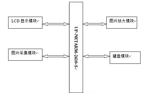 本系统以嵌入式微处理器ARM9为硬件核心,应用无线通信网技术和以太网技术,通过移植嵌入式、操作系统Linux,实现一个便携式的,通过软件放大的电子显微的一个装置。通过摄像头采集图片,然后在此基础上对图片进行放大。整体结构如图2-1所示