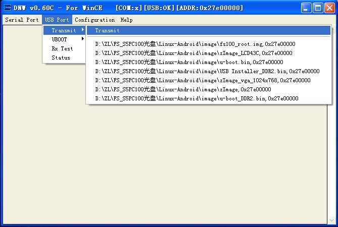 USB 下载工具软件“DWN”在“工具软件”目录下,需要将其USB 下载地址Dowload Address 设为0x27e00000,如下图: