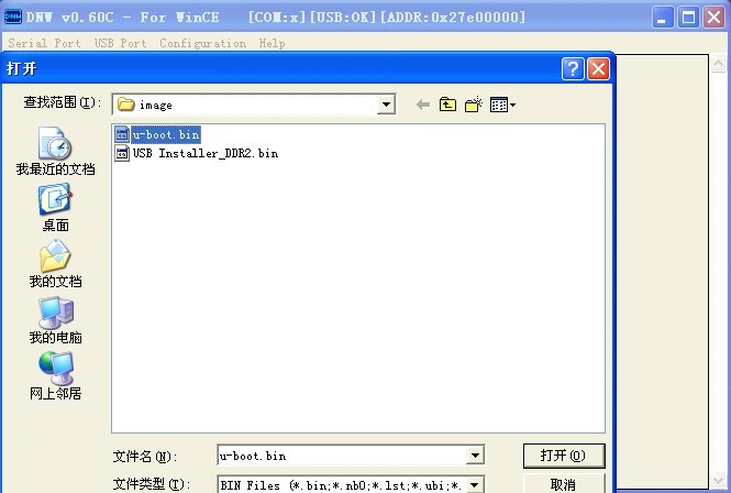 4、下载u-boot.bin:这时要注意,第一次选择下载u-boot.bin 后,要先在串口通信终端敲任意键来中
