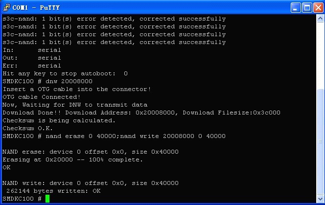 在串口通信终端中输入命令:#nand erase 0 40000;nand write 20008000 0 40000