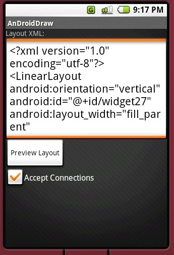 在你的电脑上运行DroidDraw,并且创建一个GUI,接下来从DroidDraw 菜单中选择"Project"->"Send GUI to Deviec"