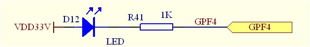 处理器S3C2410通过GPF4控制报警LED灯,如下图所示: