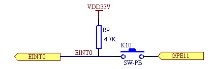 当GPE11输出0电平时,按键按下后会在EINT0管脚上产生跳沿信号。系统利用此信号产生中断。如下图所示: