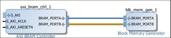 3、链接块存储器发送器到AXI4 BRAM 控制器,点击连接点拖东两者间的线:
