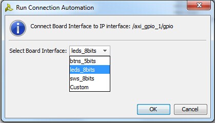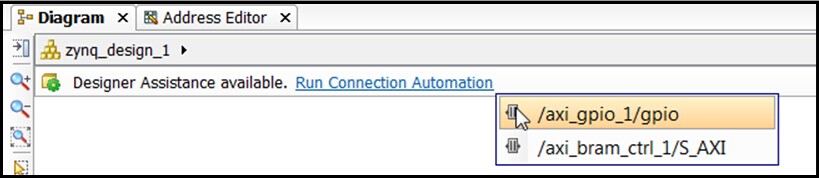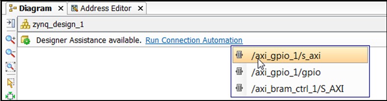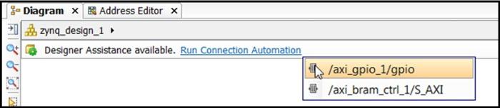 3、选择Run Connection Automation,则能够看到/axi_gpio_1/gpio如图