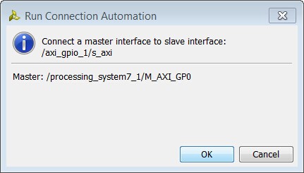 连接后自动对话框打开并且会连接到主AXI接口道次接口,在这种情况下,主助力器就是Zynq 系统的IP