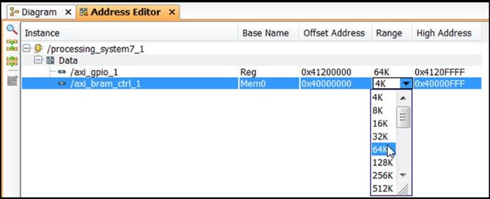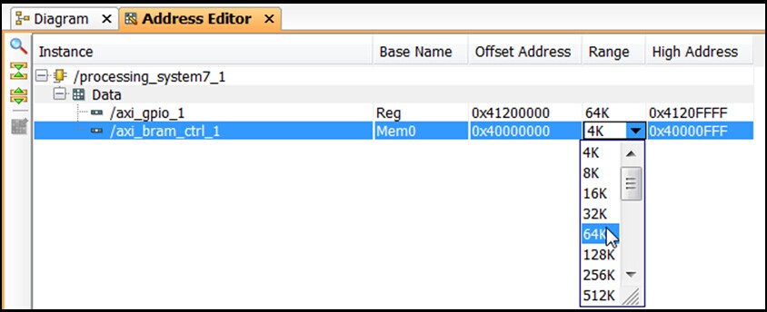 7、改变AXI BRAM控制器到64K,如下所示: