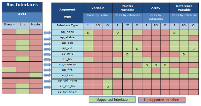 这种类型的接口能够依靠C参数通过接口综合创建,比如:一个输出有效信号能够通过接口综合,其C参数必须是一个指针,对C++来说应该是一个引用,这是因为输入的传递值必须是一个数量,具体如下图,在图中总结了接口的类型和支持的C函数的参数: