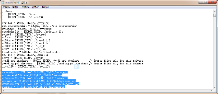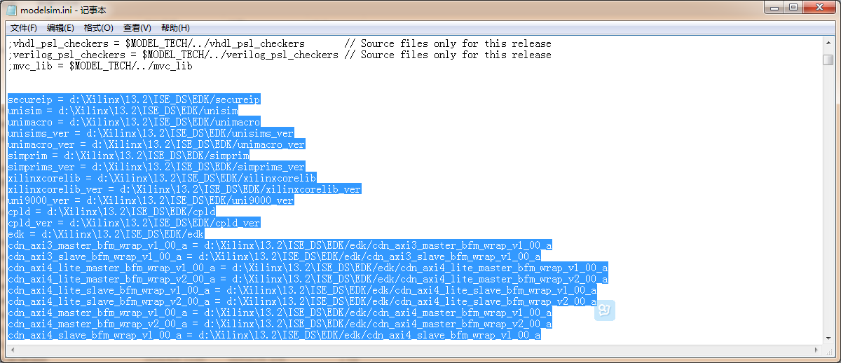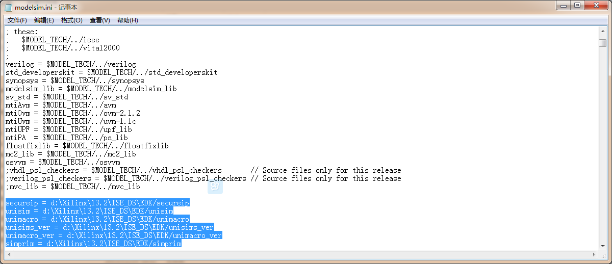 你安装的xilinx 软件的安装目录下面,找到EDK 这个文件夹,打开EDK文件夹,里面有一个modelsim.ini文件,用记事本打开,复制从secureip = d:\Xilinx\13.2\ISE_DS\EDK/secureip 开始到xps_usb2_device_v6_00_a = d:\Xilinx\13.2\ISE_DS\EDK/edk/xps_usb2_device_v6_00_a结束的所有字符。如下图: