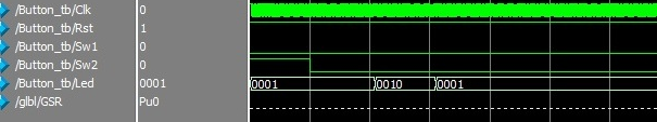 module Button_tb; reg Clk; reg Rst; reg Sw1; reg Sw2; wire [3:0] Led; Button uut (.Clk(Clk), .Rst(Rst), .Sw1(Sw1), .Sw2(Sw2), .Led(Led)); initial begin Clk = 0; Rst = 0; Sw1 = 1; Sw2 = 1; #10 Clk = !Clk; #10 Clk = !Clk; #10 Clk = !Clk; Rst = 1; forever #10 Clk = !Clk; end initial begin #100; Sw1=0; #10000000; Sw1=0; Sw2=0; end initial begin $monitor($time,,,"Led= %b ",Led); end endmodule