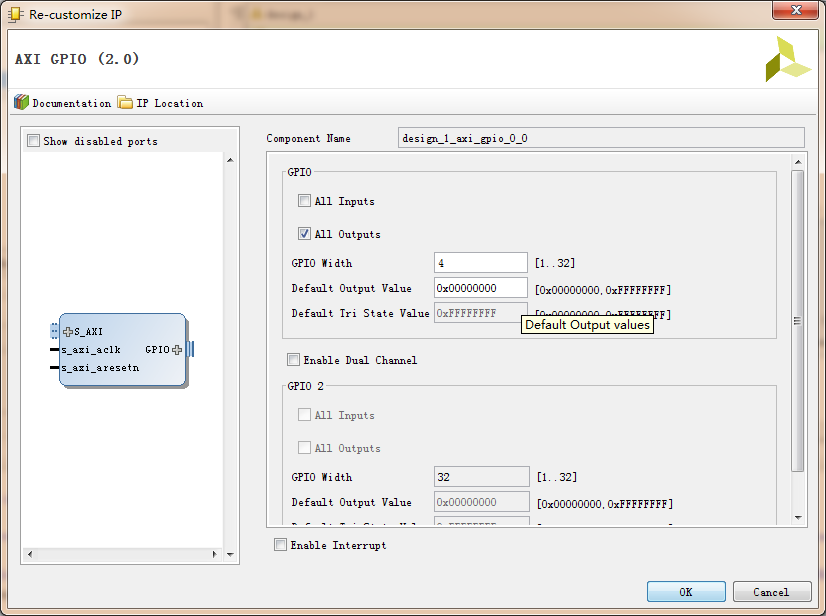5.设置完成后,点击ok。 双击AXI_GPIO,勾选 all outputs。 GPIO Width 选择4.如下图