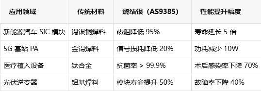 基站射频前端:** 5G 基站采用无压烧结银 AS9373,信号损耗降低 20%,单机功耗减少 10W。