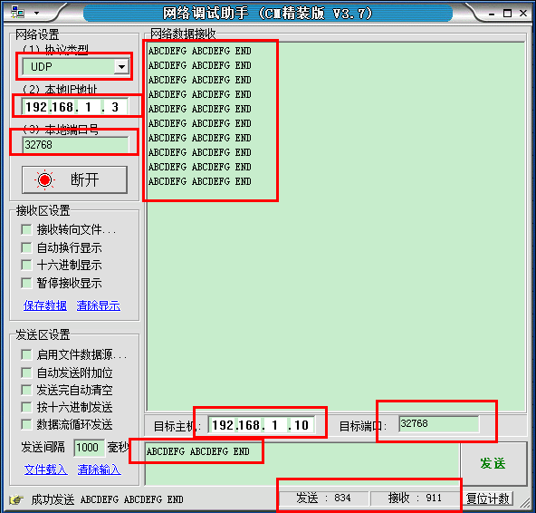 用NETassist工具,可以方便的实现网络层之上的数据收发,可以看到数据回环得到了验证。