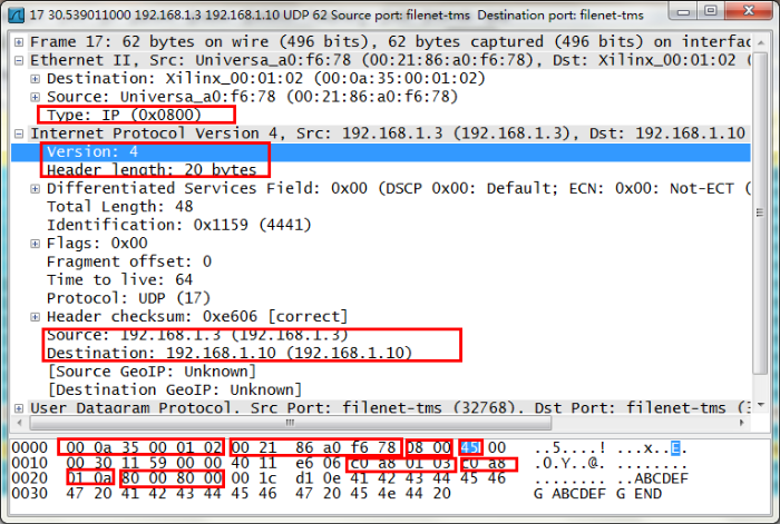 Wireshark抓数,对于正确的以太网数据包,可以查看到网络包的数据格式,包括mac数据,IP数据,udp数据。