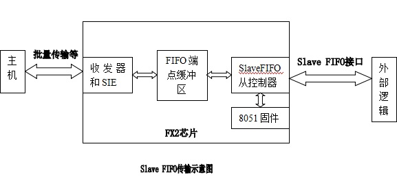 在这种方式下,FX2内嵌的8051固件的功能只是配置Slave FIFO相关的寄存器以及控制FX2何时工作在Slave FIFO模式下。一旦8051固件将相关的寄存器配置完毕,且使自身工作在Slave FIFO模式下后,外部逻辑(如FPGA)即可按照Slave FIFO的传输时序,高速与主机进行通讯,而在通讯过程中不需要8051固件的参与。
