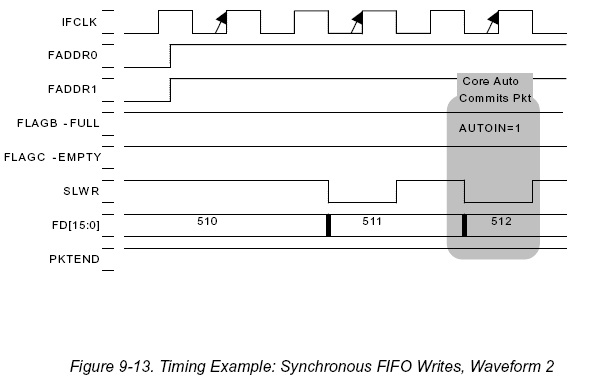 图示假定FX2设定包大小为512字节,外部逻辑向FIFO端点中写入的数据达512字节时的情况。此时FX2硬件自动将已写入的512字节打成一包准备进行传输,这个动作就和在普通传输中,FX2固件向FIFO端点中写入512字节后,把512这个数写入EPxBC中一样,只不过这个过程是由硬件自动完成的。在这里可以看出“FX2固件不参与数据传输过程”的含义了。外部逻辑只须按上面的时序图所示的时序向FIFO端点中一个一个字节(或字)地写数,写到一定数量,FX2硬件自动将数据打包传输,这一切均不需固件的参与,由此实现高速数据传输。