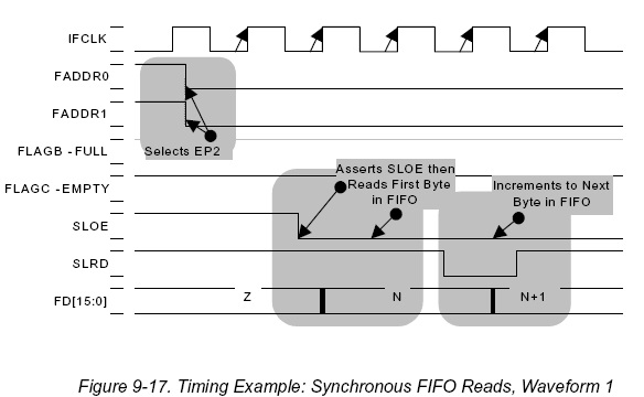 状态3:从数据线上读数,使SLRD有效,持续一个IFCLK周期,以递增FIFO读指针,进状态4;