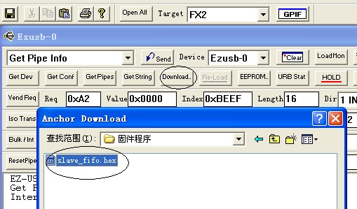上图表示连接可以进行下面测试,通过EZ_USB软件下载相应固件s3_dpram.bit程序,slavefifo.hex文件在“下载bit”目录下点击Download,