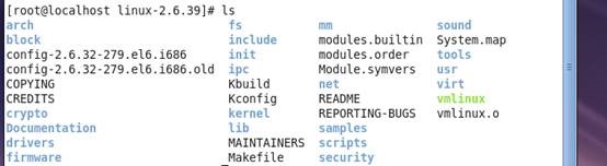 在linux中,首先将下载的2.6.39的内核压缩包解压。进入到该目录,可以看到目录下是有很多文件的。每个文件有自己的作用和功能。